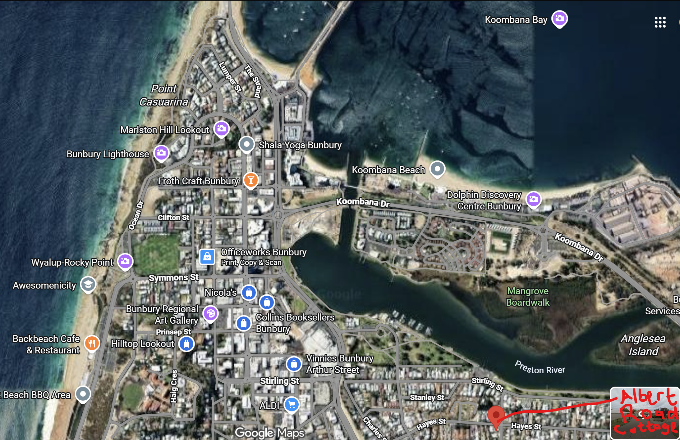 Albert Road Cottage is a block from the estuary and you can walk from Stirling Boat ramp through Queens Park into town. Walk along the estuary to come to the skatepark and free mini golf course etc. There is a 5km walk around estuary. Just follow the water till you are back at this point. The walk takes you through the most southern mangroves in the world. There's easy access to all of Bunbury's sights:including the Dolphin Discovery Centre, Bunbury Wildlife Park, Bunbury Farmers Market, Koombana Bay, Back Beach, Marlston Hill Lookout, Bunbury Lighthouse, Mangrove Boardwalk, Leschenault Inlet, Bunbury Regional Art Gallery, the CBD Mural Trail, Bunbury Museum and Heritage Centre, Wyalup-Rocky Point, South West Sports Centre, Bunbury Regional Entertainment Centre, HOYTS Cinemas, Boulters Heights, Maidens Reserve, Wardandi Boodja Sculpture, and St Patrick's Cathedral.