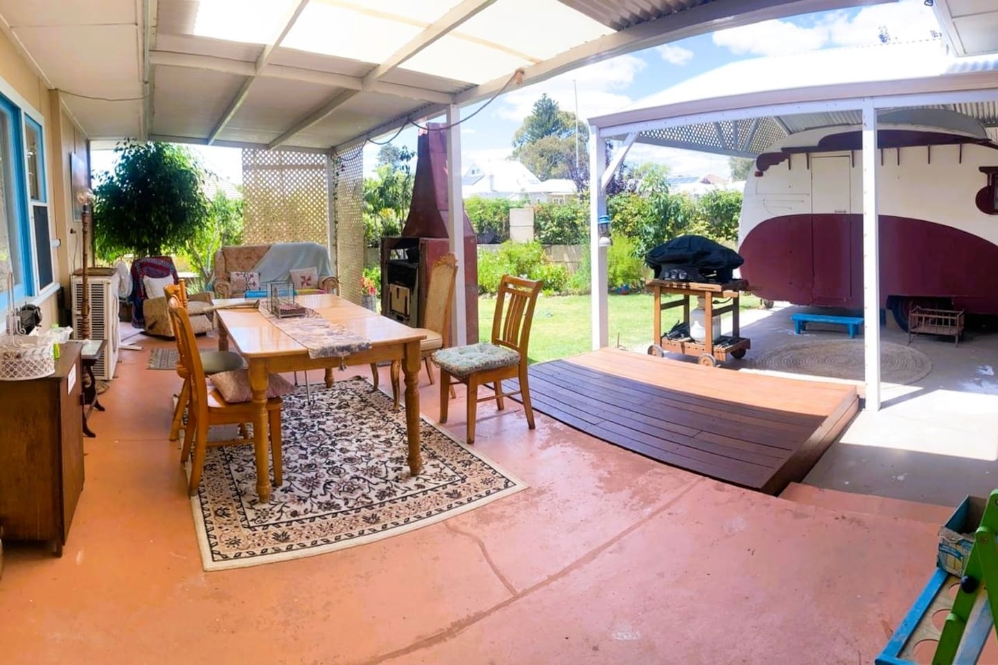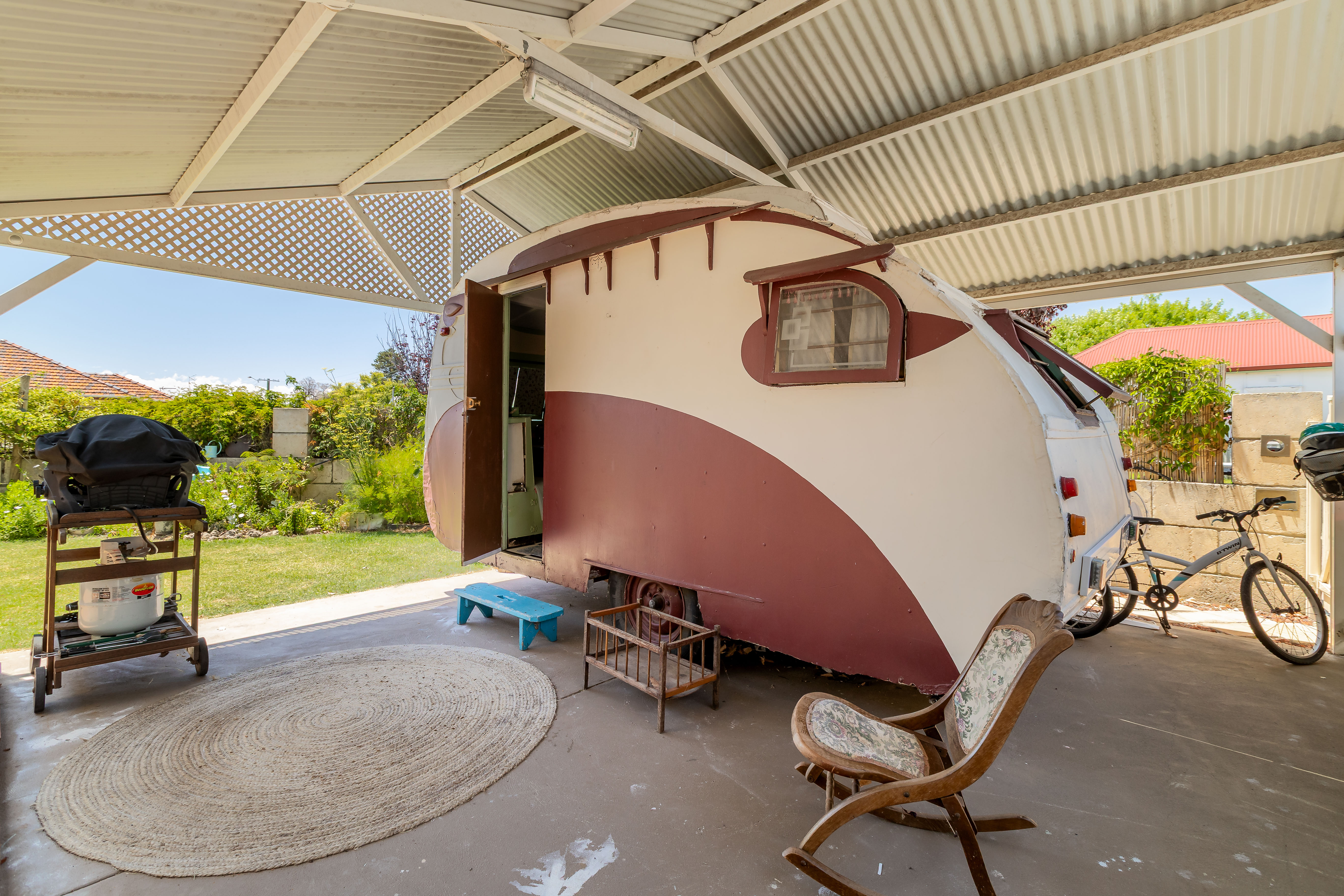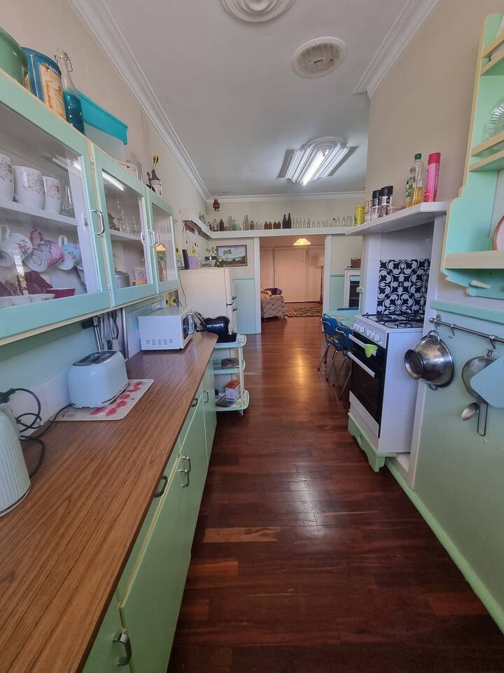 Experience a bygone era where domestic life was one of both calm and joyful class - the house represents the optimism of the post-war era. The original features and unique items in the house provide ambience, comfort and interest. The historic 1937 bondwood caravan was featured in WA author Tim Winton's Cloudstreet and is a gorgeous spot to sleep or chill with friends. It's set up with facilities to serve a drink or tea. The cottage and caravan are popular for parties, including for young teens, of up to 12 attendees. Please let me know if you wish to do this as extra facilities are provided at a reasonable price. The cottage kitchen is perfect for cooking and will meet all your needs. An oven, microwave, rice cooker and small size dishwasher, plus baking items, ensure that you can cook to your heart's contents. A coffee pod machine and milk frother are provided and salt, pepper, spices, oil etc and milk to cover you that first morning. An original Metters stove and large gas BBQ are provided outside, with an eating area and sofas to relax on the patio. Fill the cast iron bath in the garden to cool down. A laundry service is provided or access to an outdoors, shared laundry on prior request. There are books, board games and some toys for children. You could also loan the Stand Up Paddle board that can fit an adult and two children. Bikes are available for kids to ride. All bedrooms have wardrobe space. Pets are welcomed and accommodated by prior arrangement. We have provided doggie daycare for some working guests. Let me know your family or group details so I can ensure the house is set up perfectly for you. A caretaker is present in an annex with separate amenities. There are no shared areas, except for the laundry. Your absolute privacy is assured and your area is locked. Also consider looking at my Ocean Drive Home, my 70s inspired home that easily accommodates 8 with a large outdoor area. If you are staying more than a few days, a cleaner can do a refresh for a cleaning fee. Late and early check ins are also available. Please request either of these if required. The STRA registration number is STRA6230AF274WO3.